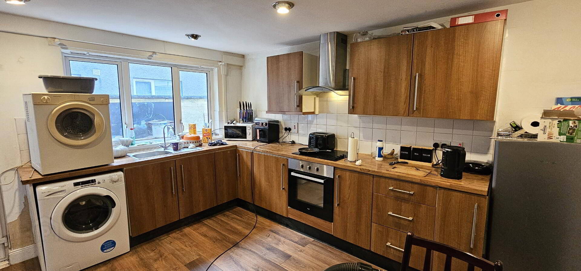 Kitchen - 13'0" x 12'3" (3.96m x 3.73m). Excellent range of high and low level units with single drainer stainless steel sink unit. Integrated oven and hob with overhead stainless steel extractor fan. Access for fridge freezer. Plumbed for washing machine. Access for fridge freezer. Complementary wall tiles. Laminate wooden floor. Recessed ceiling lighting. Double radiator. Upvc double glazed window.