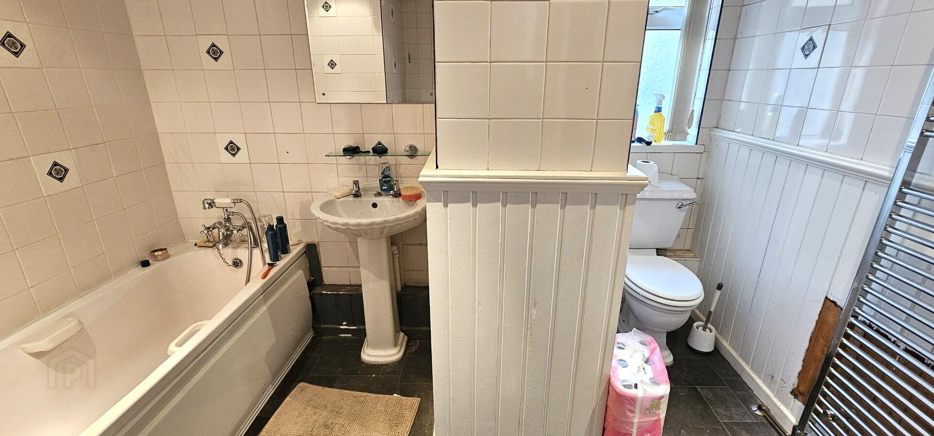 Bathroom - White three piece suite comprising of panelled bath with mixer taps and telephone handle shower attachment, pedestal wash hand basin and low flush WC. Fully tiled walls. Hot press with insulated copper cylinder tank. Vinyl floor covering. Chrome heated towel rail. Recessed ceiling lighting. Upvc double glazed window.