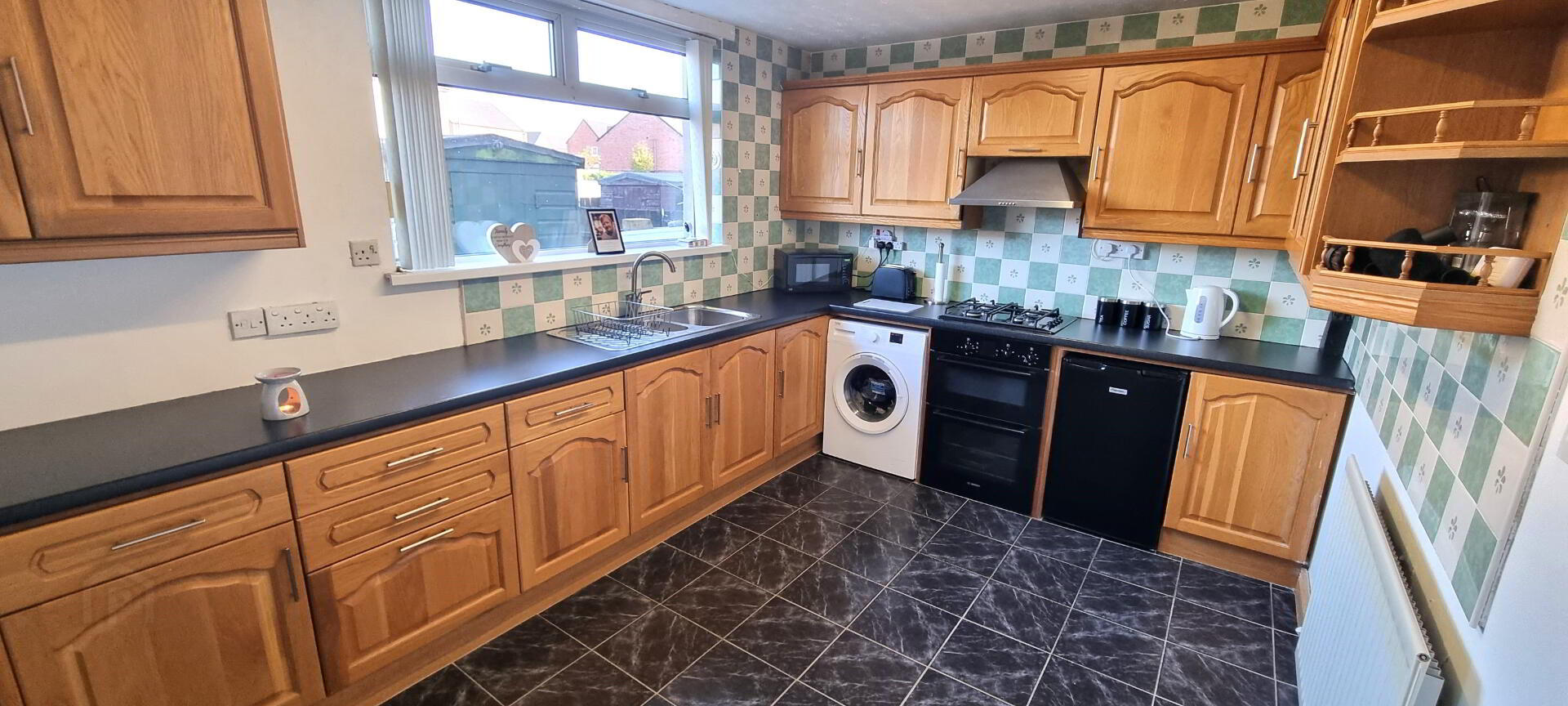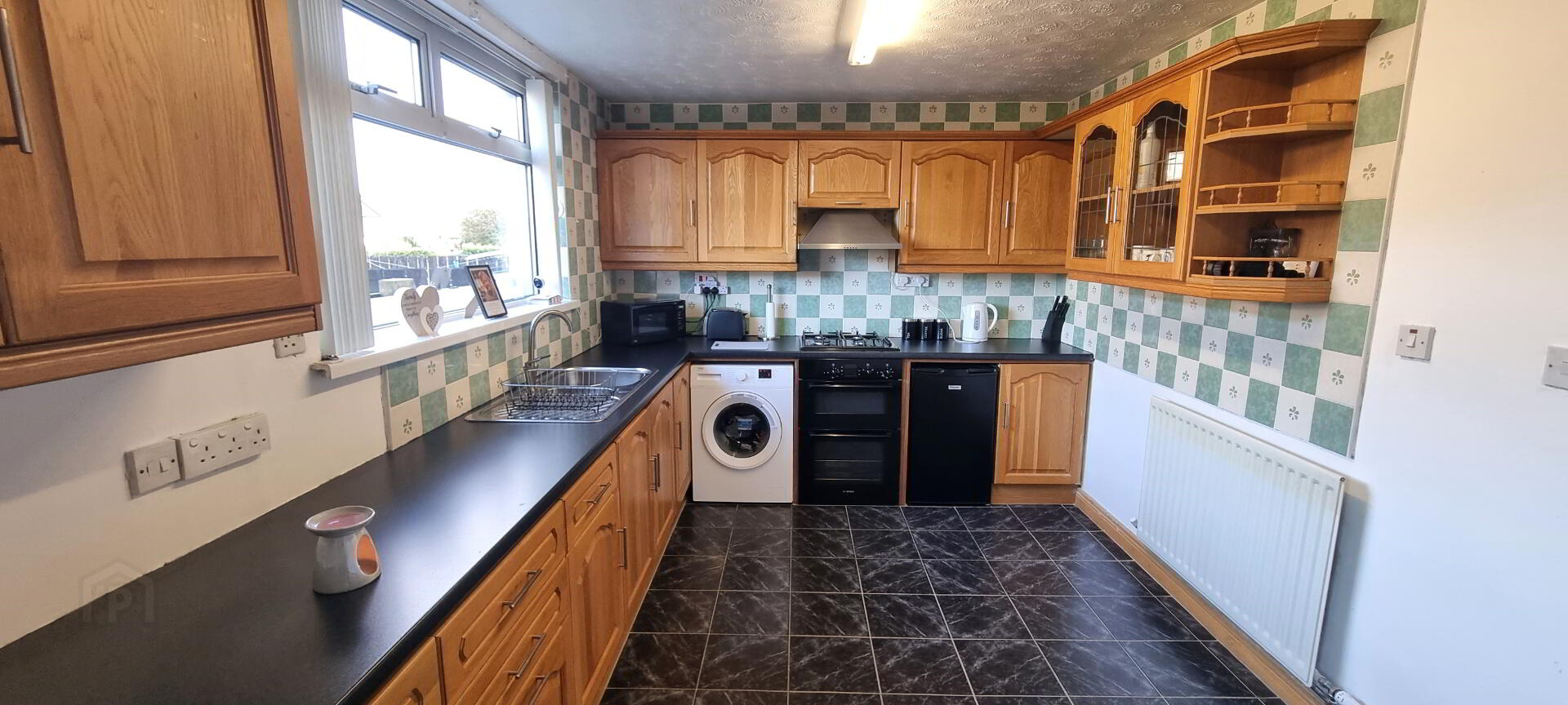 KITCHEN - 13'3" x 9'8"(4.04m x 2.95m). Excellent range of high and low level fitted units with single drainer stainless steel sink unit with mixer tap. Integrated oven with gas hob. Stainless steel extractor fan. Leaded glass display cabinet with open ended corner displays. Complementary wall tiles. Plumbed for washing machine. Part tiled walls. Ceramic tiled floor. Single radiator. UPVC double glazed window.