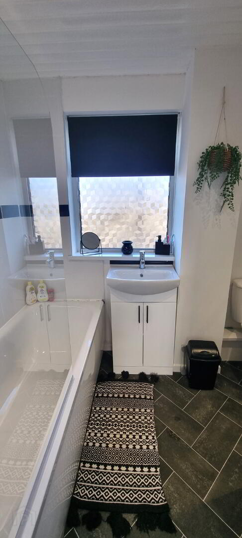 MODERN BATHROOM. Recently installed three piece white suite comprising of pedestal wash hand basin with modern vanity unit. Button flush w.c. Panelled bath with fixed shower screen and electric shower above. Part tiled walls. Recessed ceiling lighting. Tile effect vinyl floor covering. Heated towel rail. UPVC double glazed window.