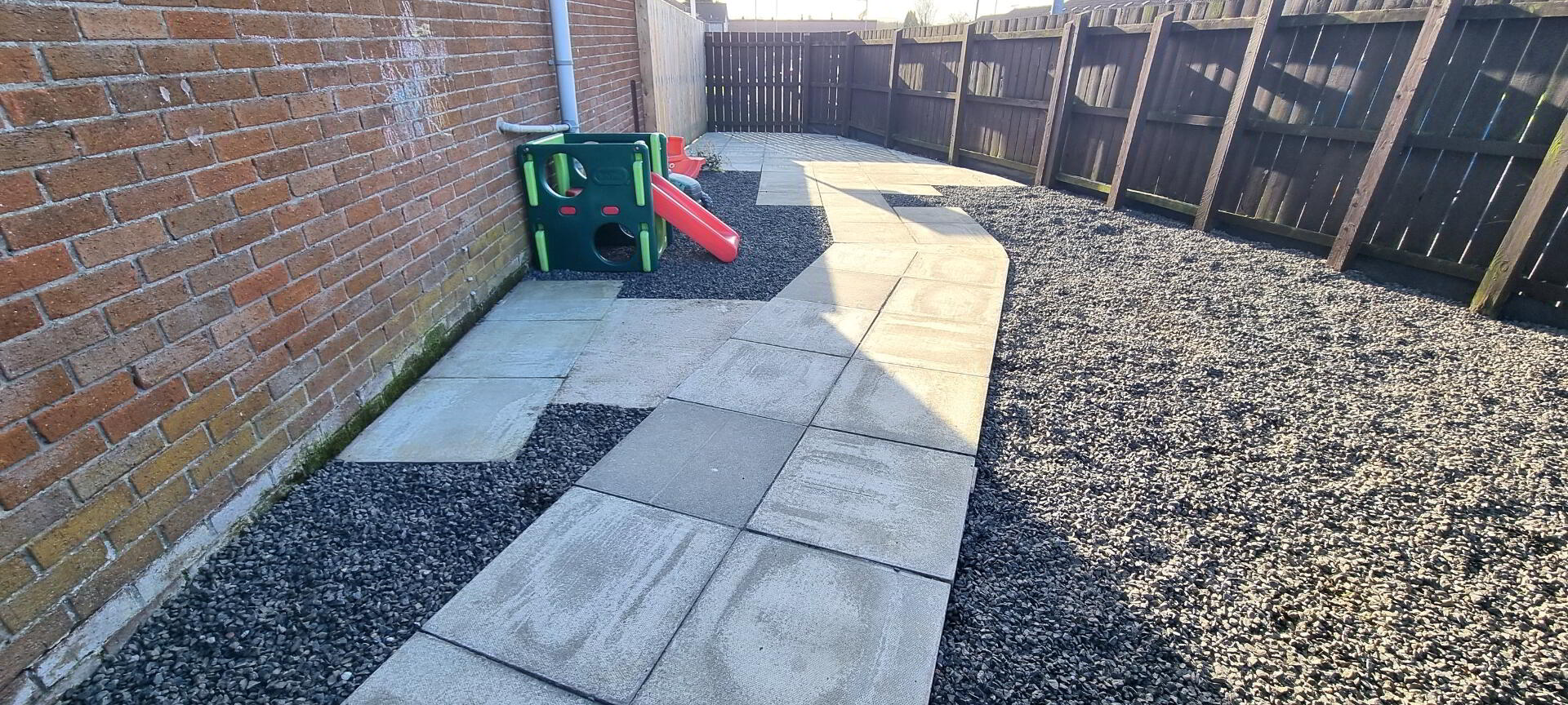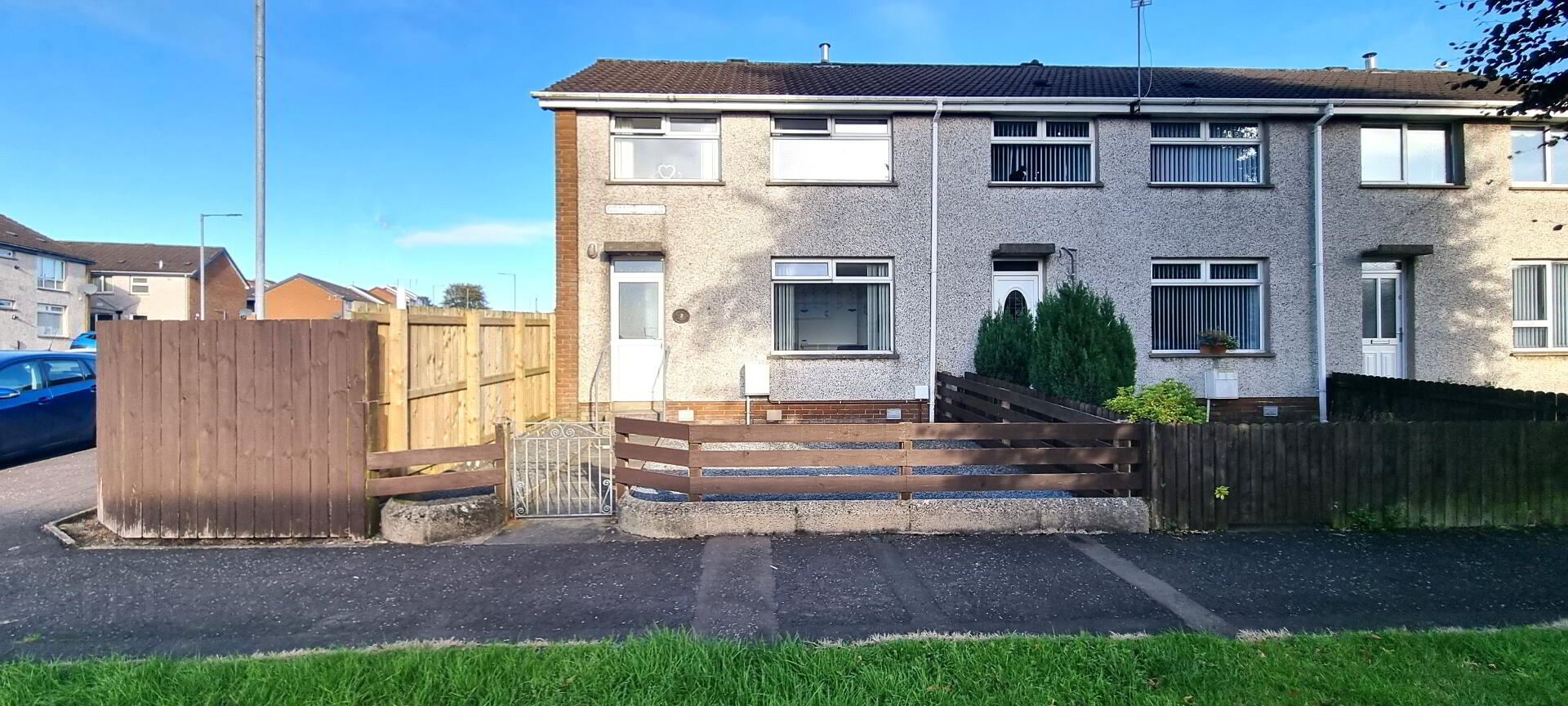 OUTSIDE - Front laid out in grey stones. Situated on a corner site with paving & grey stones screened by timber fence securing maximum privacy. Twin gates to rear patio area for off street parking. Timber shed.