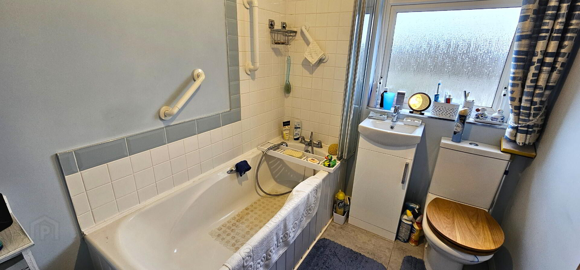 Bathroom- Modern three piece white suite comprising of panelled bath with mixer taps and telephone handle shower attachment, pedestal wash hand basin with vanity unit and push button WC . Ceramic tiled floor. Chrome heated towel rail. Upvc double glazed window.