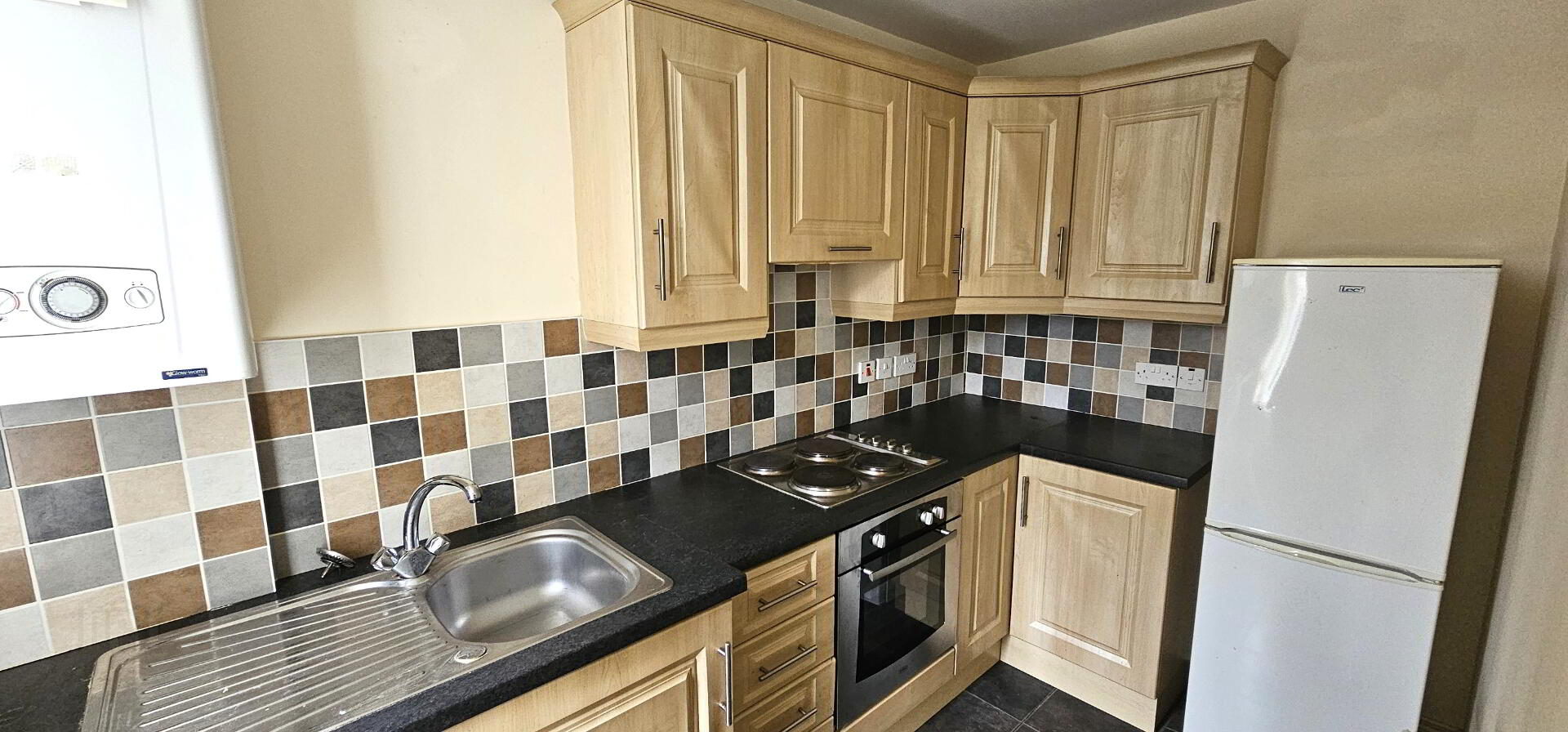 Kitchen - 10'0" x 5'5" ( 3.05m x 1.66m). Excellent range of modern high and low level shaker style units with single drainer stainless steel sink unit. Integrated oven and hob with overhead extractor fan. Access for fridge freezer. Complementary wall tiles. Recessed ceiling lighting. Ceramic tiled floor. Double radiator. Upvc double glazed window.